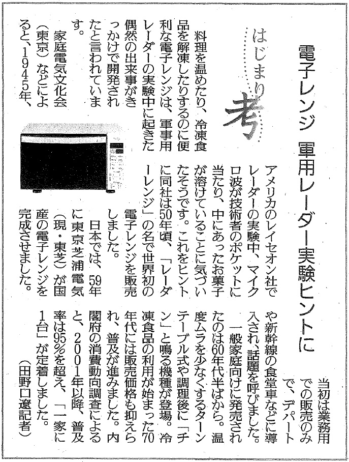 〔はじまり考〕電子レンジ 軍用レーダー実験ヒントに